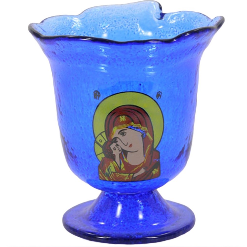 ΕΠΙΤΡΑΠΕΖΙΟ ΚΑΝΔΗΛΙ ΑΠΟ ΧΕΙΡΟΠΟΙΗΤΟ ΓΥΑΛΙ ΒΑΜΜΕΝΟ ΜΕ ΑΝΘΕΚΤΙΚΟ ΧΡΩΜΑ ΚΑΙ ΜΕ ΤΗΝ ΕΙΚΟΝΑ ΤΗΣ ΠΑΝΑΓΙΑΣ.