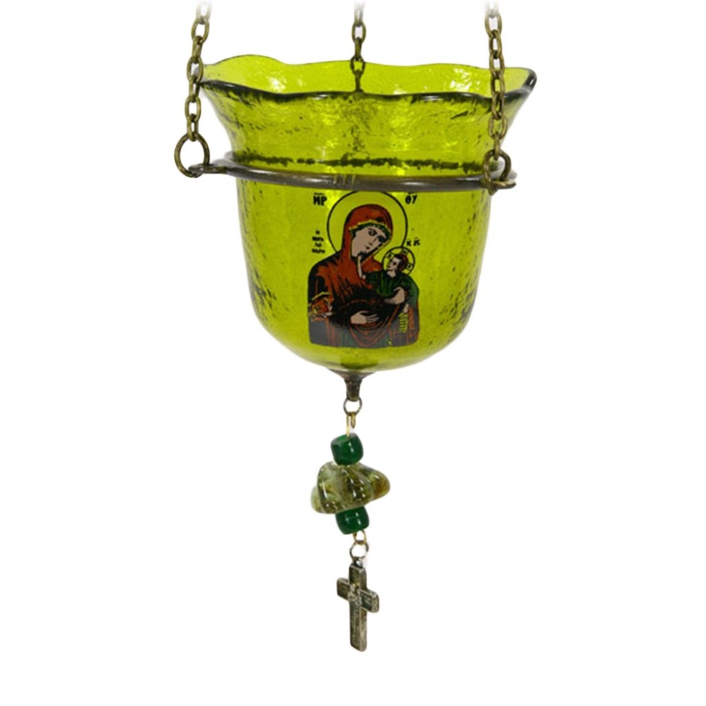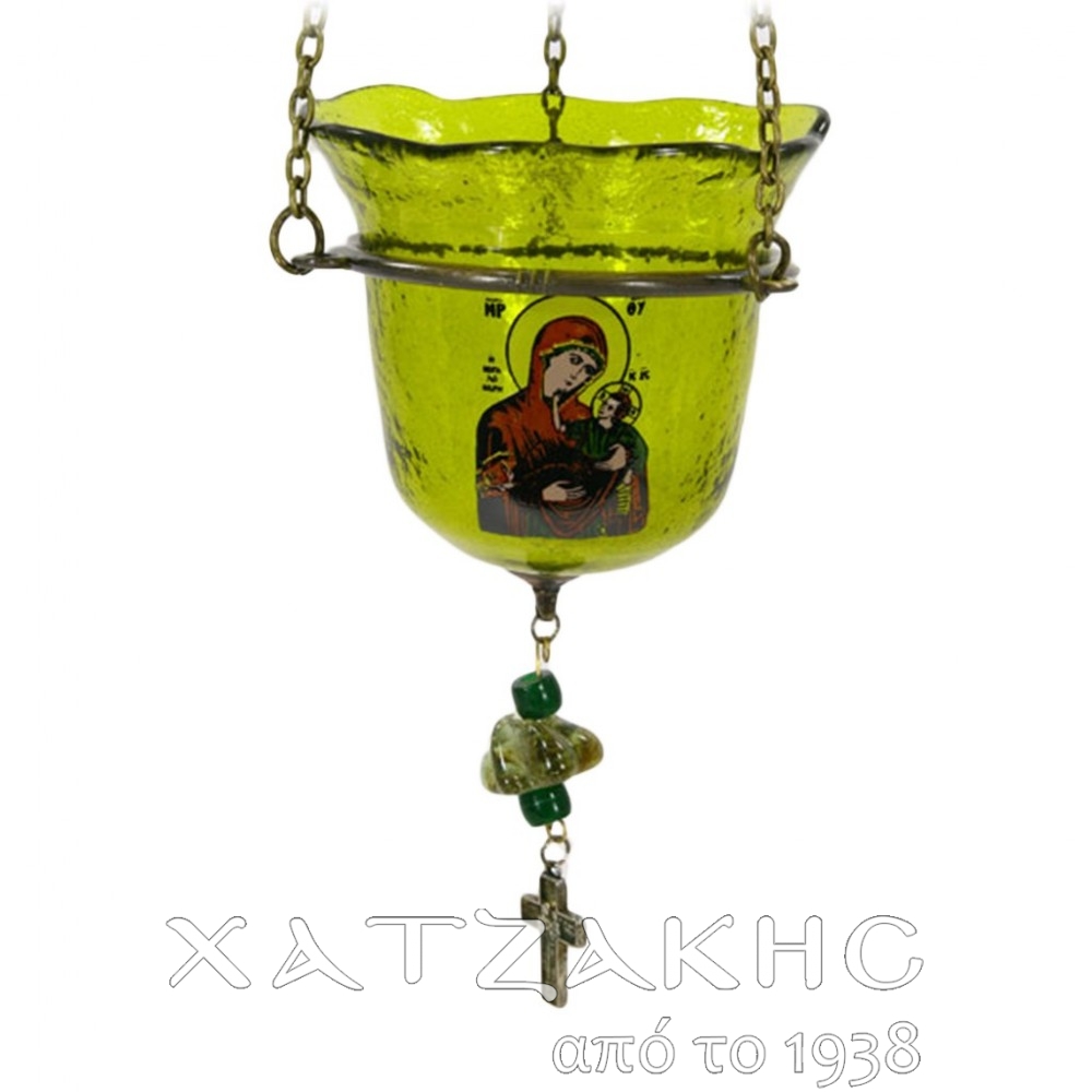 ΚΡΕΜΑΣΤΟ ΚΑΝΔΗΛΙ ΑΠΟ ΧΕΙΡΟΠΟΙΗΤΟ ΓΥΑΛΙ ΒΑΜΜΕΝΟ ΜΕ ΑΝΘΕΚΤΙΚΟ ΧΡΩΜΑ ΚΑΙ ΜΕ ΤΗΝ ΕΙΚΟΝΑ ΤΗΣ ΠΑΝΑΓΙΑΣ.