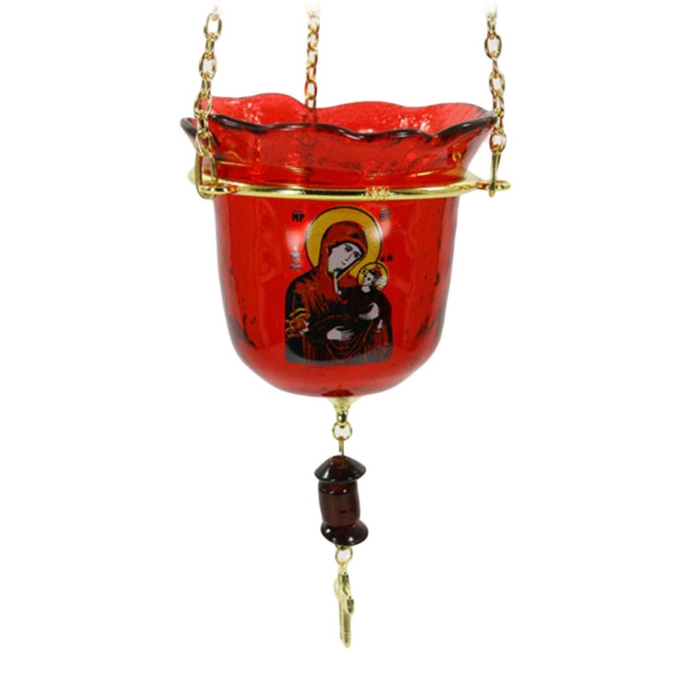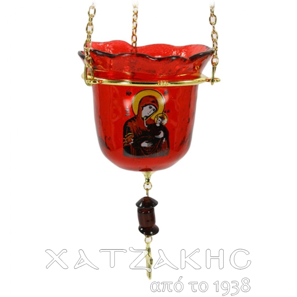 ΚΡΕΜΑΣΤΟ ΚΑΝΔΗΛΙ ΑΠΟ ΧΕΙΡΟΠΟΙΗΤΟ ΓΥΑΛΙ ΒΑΜΜΕΝΟ ΜΕ ΑΝΘΕΚΤΙΚΟ ΧΡΩΜΑ ΚΑΙ ΜΕ ΤΗΝ ΕΙΚΟΝΑ ΤΗΣ ΠΑΝΑΓΙΑΣ.